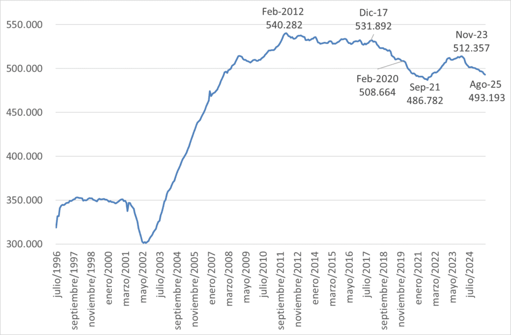SumateHay dos fuentes que permiten seguir la cantidad de empresas por sector, tamaño y provincia. La más conocida es el Observatorio de Empleo y Dinámica Empresarial (OEDE) del Ministerio de Capital Humano. Pero, para el caso de las empresas, su periodicidad es anual, por lo que hay datos hasta 2024. La otra fuente disponible es la Superintendencia de Riesgos del Trabajo (SRT), la cual sí tiene datos mensuales que hoy llegan hasta agosto de 2025.