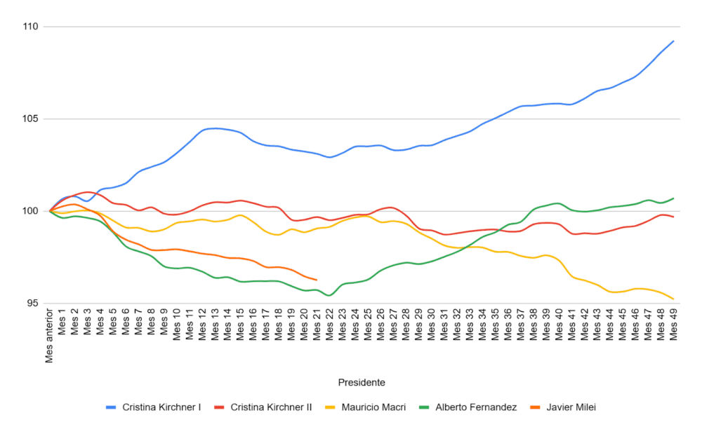 Dentro de este declive general, se pueden identificar algunos períodos: una tendencia muy levemente declinante hasta diciembre de 2017; una fuerte reducción hasta febrero de 2020 por las crisis cambiarias que pusieron fin a las esperanzas de reelección de Mauricio Macri; la caída y posterior recuperación de la pandemia; y la disminución actual.