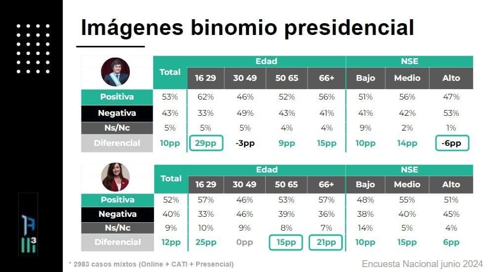 Mora Jozami, consultora de Casa Tres, exploró los matices por sectores y edades respecto a la imagen de Milei y Villarruel. Tienen indicadores parecidos y funcionan, según Jozami, de manera complementaria: el presidente rankea mejor entre los jóvenes y la vice entre los de mayor edad. Es difícil, entonces, escindir a uno de otro. Facundo Nejamkis, de Opina Argentina, interpreta lo mismo. Advierte que más allá de alguna diferencia, comparten el universo de respaldos y adhesiones. En general, la negativa de Villarruel es más baja que la de Milei.