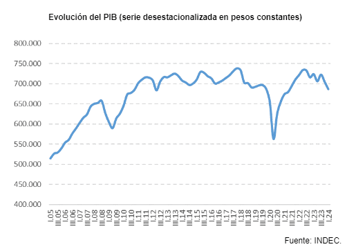 La comparación (desestacionalizada) con el trimestre anterior arrojó una caída del 2,6%, que se suma al 2,5% que el PIB ya se había contraído en el último trimestre del 2023. Esto llevó a que el tamaño de la economía argentina sea prácticamente el mismo que a mediados del 2012, es decir, 12 años consecutivos de estancamiento. Tenemos un problema realmente serio y estructural.