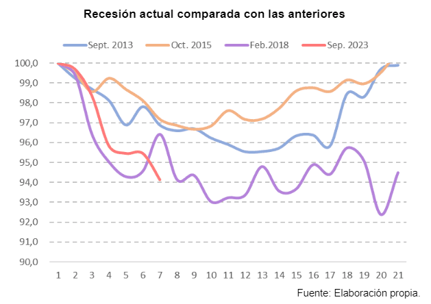 SumateEl gráfico a continuación toma como punto de partida el mes en el que se inició la contracción de la actividad y, a partir de eso, cómo evolucionó y cuánto tardó hasta recuperar todo el terreno perdido. Al comparar la recesión actual con las anteriores, dejando de lado la pandemia porque obedece a causas extraordinarias, vemos que la magnitud de la caída actual es similar a la de 2019. Lo que todavía no está claro es si la actividad ya tocó fondo y comienza un repunte sostenido -como sucedió en la salida de la recesión del 2015 y la del 2013- o si la economía va a estancarse en este nivel, tal como sucedió en la recesión del 2018. De cualquier manera, la recuperación en “V” parecería completamente descartada (algo que ya habíamos adelantado acá hace 2 meses).