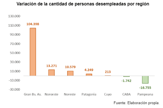 Por último, y también vinculado con lo anterior, casi la totalidad del aumento en el número de personas desempleadas respecto al año anterior (unas 114,200) proviene de la provincia de Buenos Aires.