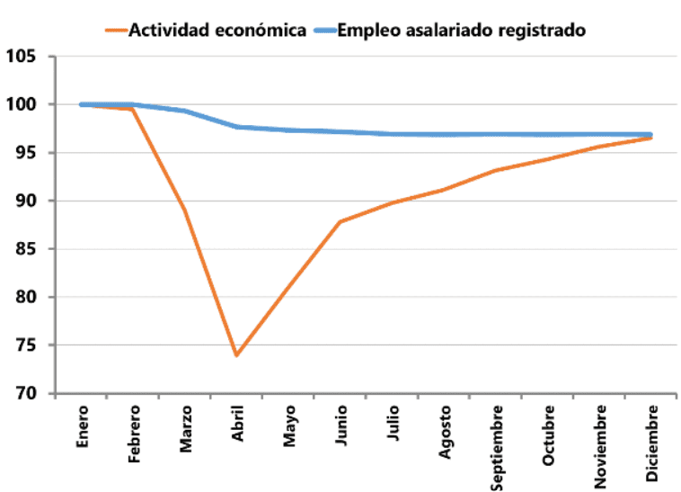 La suerte del sector formal fue marcadamente diferente. En efecto, las políticas de contención del empleo (doble indemnización, prohibición de despidos sin causa, programa ATP de pago de salarios y reducción de contribuciones, y acuerdos de suspensiones con pago del 75% del salario) lograron evitar lo que hubiera sido una estrepitosa caída del trabajo asalariado registrado en el sector privado. Es el de mayor calidad y el más difícil de recuperar. En efecto, mientras la actividad económica se desplomaba al inicio de la crisis sanitaria —durante el mes de abril se registró una contracción interanual del 25,3%— el empleo asalariado registrado en el sector privado amortiguaba el golpe y se contraía “solo” un 3%. Es un valor importante pero que contrasta con el 43% y el 27% de caída del empleo informal y el trabajo por cuenta propia.