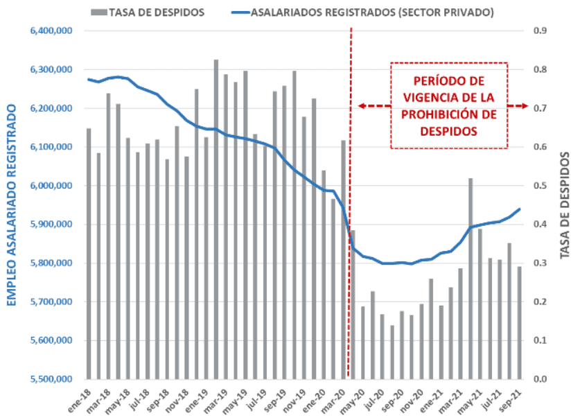 Los datos son elocuentes al respecto. Desde que se desató la pandemia, la prohibición de los despidos fue eficaz para sostener el empleo formal. Mientras la medida se mantuvo vigente, los despidos se situaron en los valores mínimos al menos desde el año 2005, que es cuando comienza la serie estadística. A su vez, esta política no impidió que desde fines de 2020 comenzara la recuperación del trabajo asalariado en el sector privado. En efecto, entre octubre de 2020 y septiembre de 2021, se recuperó el 75% de los empleos formales destruidos entre febrero y octubre de 2020. En definitiva, este cuadro de situación permite comprender dos fenómenos. La prohibición de despidos funcionó, primero, y, luego, no impidió que el mercado de trabajo comenzara a moverse.