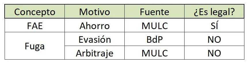 Los dos motivos principales por detrás de este tipo de operatorias son i) evadir los impuestos locales y ii) prevenir la confiscatoriedad (como lo que sucedió con el “corralito”). Un típico movimiento que sería clasificado como parte de la fuga de capitales sería la subfacturación de exportaciones. Por ejemplo, una empresa que declara haber exportado bienes por un valor de USD 100.000, pero que en realidad los vendió por USD 200.000. En ese caso se registraría una operación de ingreso de divisas en el mercado cambiario por USD 100.000 mientras que los USD 100.000 restantes los mantiene en una cuenta en el exterior. Otro caso es lo que se conoce como los dólares “en el colchón”, que en realidad son guardados en cajas de seguridad. Generalmente se asocian con compras pequeñas muchas veces realizadas en el mercado cambiario (lo que sería la FAE en billete), pero que luego son atesorados en cajas de seguridad y no se declaran frente a la AFIP (evadiendo el pago de impuestos).