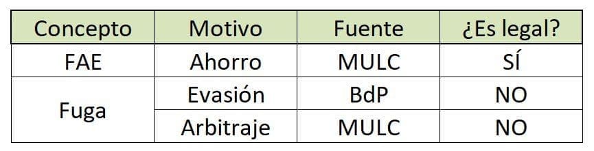 La “fuga”, en cambio, es un concepto más esquivo. No existe técnicamente una determinada operación financiera que sea definida como tal. Comúnmente se la asocia con operaciones ilícitas que, como su nombre lo indica, implican salidas de dólares hacia el exterior, por ejemplo a los famosos paraísos fiscales. Pero también existen definiciones más abarcativas que pueden incluir toda salida de divisas al exterior (incluidas las operaciones legales).