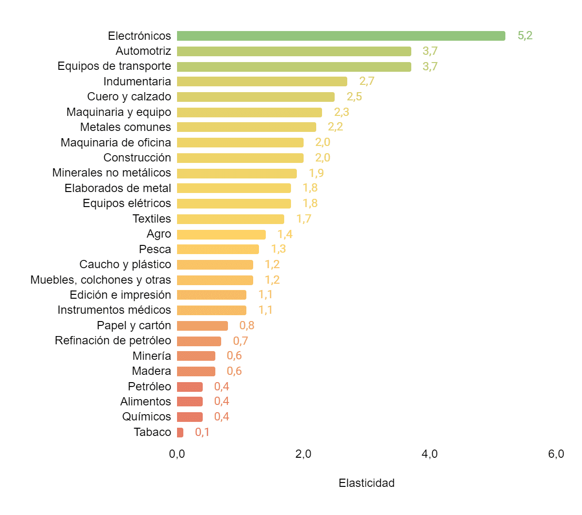 La consultora Audemus publicó hace un mes un análisis sobre la elasticidad de la producción por rama productiva y el producto nacional. El resultado al que llegaron es que existe una fuerte heterogeneidad entre las diferentes actividades económicas a la hora de verse impactadas por el crecimiento económico a nivel general. Pero, ¿qué significan estos números? Básicamente, la elasticidad que calcularon refleja cuánto aumenta -o cae- la producción de un sector cuando sube un punto el PBI. Entonces, en el caso de los productos electrónicos (por ejemplo, las televisiones y celulares), por cada punto que aumenta el PBI, la producción de ese sector aumenta en 5,2 puntos porcentuales. En cambio, los sectores que tienen un valor cercano a uno, se mueven más parecido a la economía en su conjunto y los menores a uno tienen una variación menor y casi independiente del PBI.