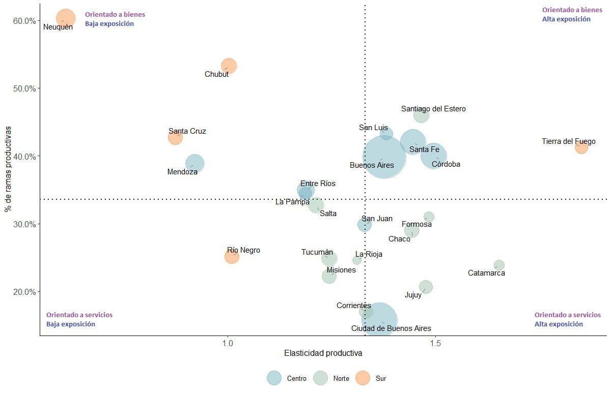 Ya sé, puede ser un tanto complicado leer el gráfico, no te preocupes. Mi sugerencia: dedicale unos minutos. En líneas generales, las provincias por encima de la línea punteada horizontal están relativamente más orientadas a bienes. Las que están del lado derecho de la vertical punteada, están más expuestas a la recesión.