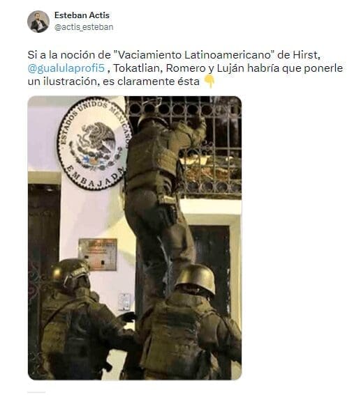 “El episodio desde el punto de vista del derecho internacional es clarísimo; Ecuador ingresó por la fuerza, incluso hubo maltrato evidente al jefe de la misión mexicana, y así se comete una violación a la Convención de Viena sobre relaciones diplomáticas, que establece que los locales de las embajadas son inviolables y tienen inmunidad y, por lo tanto, las fuerzas locales no pueden ingresar sin autorización del Estado extranjero”, comentó Chehtman sobre el artículo 22 de la convención.