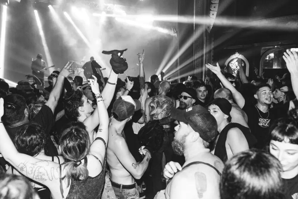 Ahora, en el galpón de Chacarita, con la luz azul que te hace ver medio fuera de foco, el humo frenético de la gente, las visuales glitcheadas de las pantallas, el trance empieza con “Un poco más de consideración” y dura casi dos horas de show, 21 temas. La gente, los chabones, se mueven en masa, apretados. Desde afuera se ven algunos brazos que señalan al cielo –al techo– como subrayando una estrofa, dirigiendo esta sinfonía para su corazón.