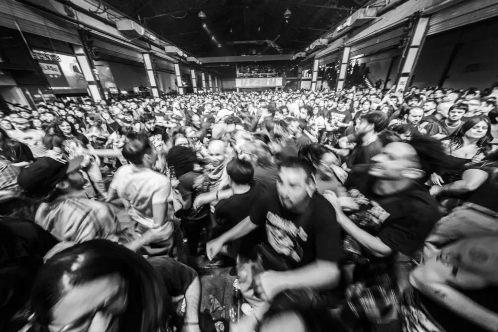 Desde la bandeja superior se ve la escena dantesca: el lungo que rascaba un ticket en la puerta pudo entrar, está en el medio del pogo que no es tanto un pogo sino una conversación móvil, un sistema solar muy complejo donde cada persona es un planeta y se atraen y se repelen como en una coreografía magnética. Se hablan entre ellos, se cantan, se abrazan, se empujan, la birra vuela, ¿por qué la birra vuela así?, es como un aspersor. Algunos miran al escenario, pero la mayoría está mirándose entre ellos. El show es ese agite. El rock del agite encontró su banda viva