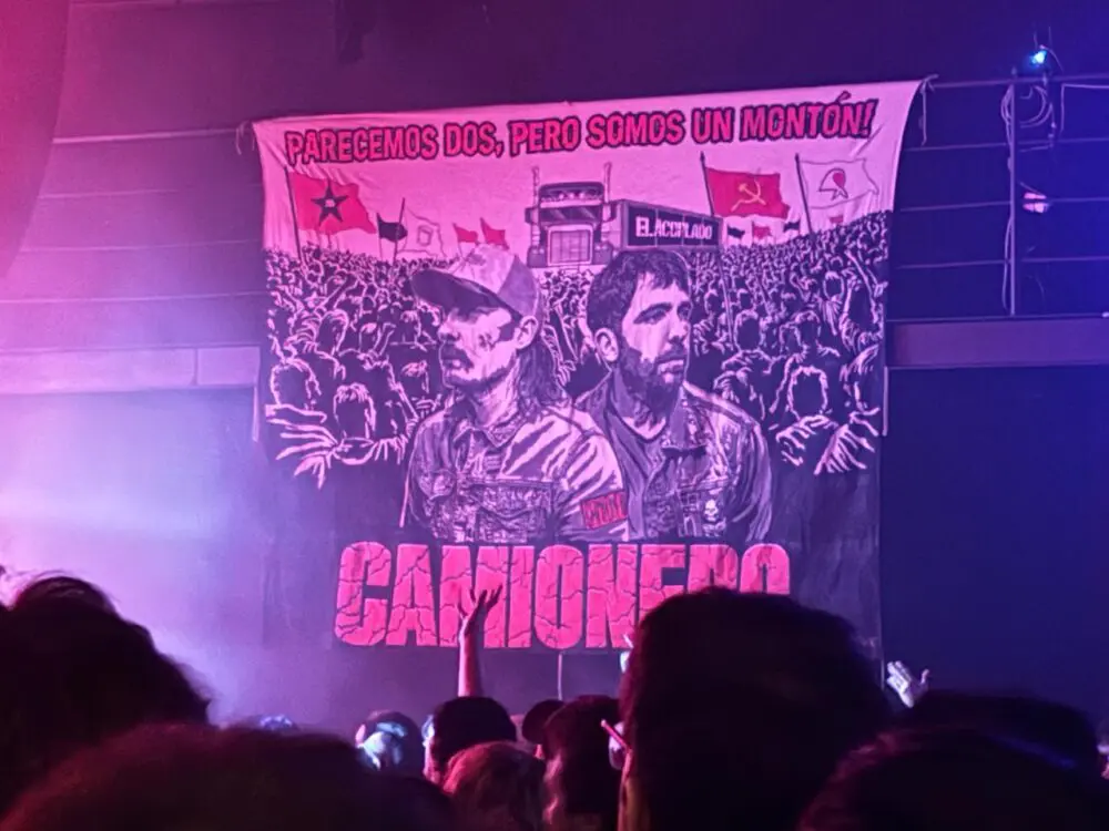 En Camionero es explícito: la hoz y el martillo están detrás de la batería de Santiago Luis. La bandera que cuelga de uno de los lados, bien soviética, repite una frase que se ve en afiches, remeras, flyers: “Parecemos dos, pero somos un montón”. Hay una estética comunista pero de la tradición Rocambole y su Oktubre ricotero. De hecho, eso suena entre banda y banda. La monada canta “el que no salta votó a Milei” o el clásico “adonde vayan los iremos a buscar”.