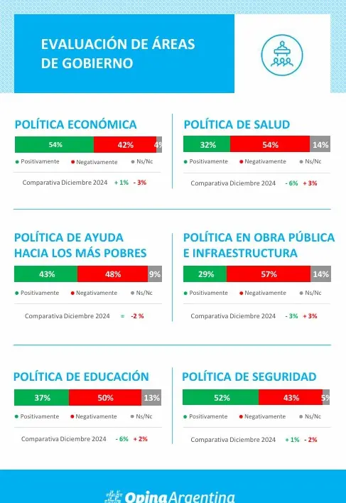 La hermanísima, en cuanto a su propia impronta, no logra subirse con la buena performance libertaria. Según el estudio de enero de #Opina, de Facundo Nejamkis, Milei tocó el punto más alto de buena imagen –53%– aunque se nota una caída en las áreas sociales del Gobierno como Salud, Educación y Obra pública.