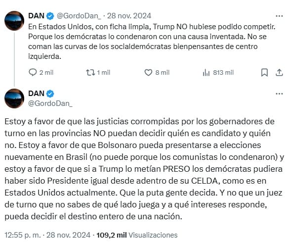 Ahí se produce un bucle espacio-temporal. Desde la Corte, Horacio Rosatti y Carlos Rosenkrantz deslizaron que el tribunal es la última instancia para resolver culpabilidad y que, según ese criterio, la prohibición de competir con “doble conforme” sería inconstitucional en la medida que no exista una intervención última de la Corte. El proyecto del PRO que impulsó Silvia Lospennato y que naufragó el año pasado incluía ese punto que ahora agregó el texto que enviará el Gobierno. Por entonces, la task force libertaria festejó que el texto se cayera. “Que la puta gente decida. Y no que un juez de turno, que no sabés de qué lado juega y a qué intereses responde, pueda decidir el destino entero de una nación”, tuiteó por entonces Daniel Parisini, el Gordo Dan. El proyecto que enviará Milei no corrige el peligro que, muy razonablemente, planteó el tuitero al mencionar el caso Trump en EE.UU. y la situación que ahora atraviesa Jair Bolsonaro.
