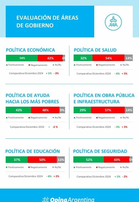 La hermanísima, en cuanto a su propia impronta, no logra subirse con la buena performance libertaria. Según el estudio de enero de #Opina, de Facundo Nejamkis, Milei tocó el punto más alto de buena imagen –53%– aunque se nota una caída en las áreas sociales del Gobierno como Salud, Educación y Obra pública.