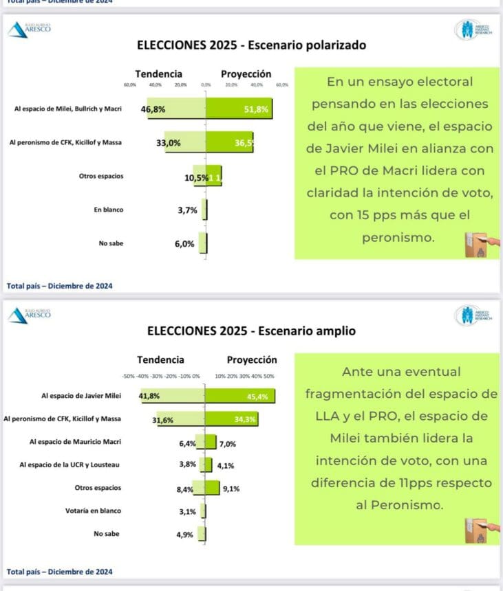 El informe de ARESCO de diciembre pasado muestra que, a nivel nacional, la alianza LLA-PRO retiene casi mecánicamente lo que juntan por separado. A esa foto, Federico Aurelio le agregó una nota al pie: la ecuación total país no se replica en PBA ni en CABA donde el PRO, individualmente, luce más competitivo que en la sumatoria nacional. Respecto a la provincia de Buenos Aires en LLA hacen una lectura anexa: más que la fusión con el PRO, la prioridad de la Casa Rosada es incentivar la fractura del peronismo en dos –en lo posible, tres– ofertas electorales.