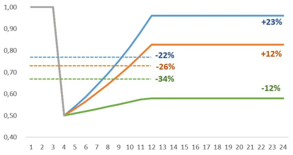 Hagamos un ejercicio hipotético, que nos va a servir para entenderlo mejor. En el gráfico debajo pueden ver 3 escenarios de recuperación para una misma variable, la cual sufrió una fuerte caída en el tercer mes del año (similar a lo que sucedió con el COVID-19 en marzo del año pasado). En todos los casos, luego se asume que durante todo el segundo año la variable se mantiene constante.