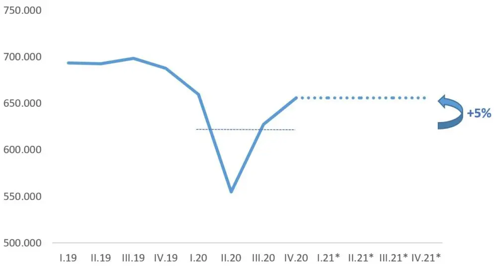 Aclarado el concepto, pasemos al análisis de las variables reales. Lo primero a destacar es que el repunte de la actividad económica fue mejor de lo esperado en la segunda parte del 2020, lo cual deja un arrastre del 5% para 2021. Como vimos, esto significa que, aun suponiendo un estancamiento total de la economía para todo el año, igual se vería un incremento del PBI del 5% (ya que la comparación se realiza contra el promedio del 2020).
