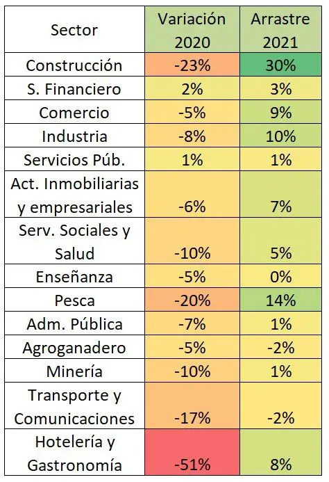 Evolución de la actividad económica por sector en 2020 y arrastre para 2020