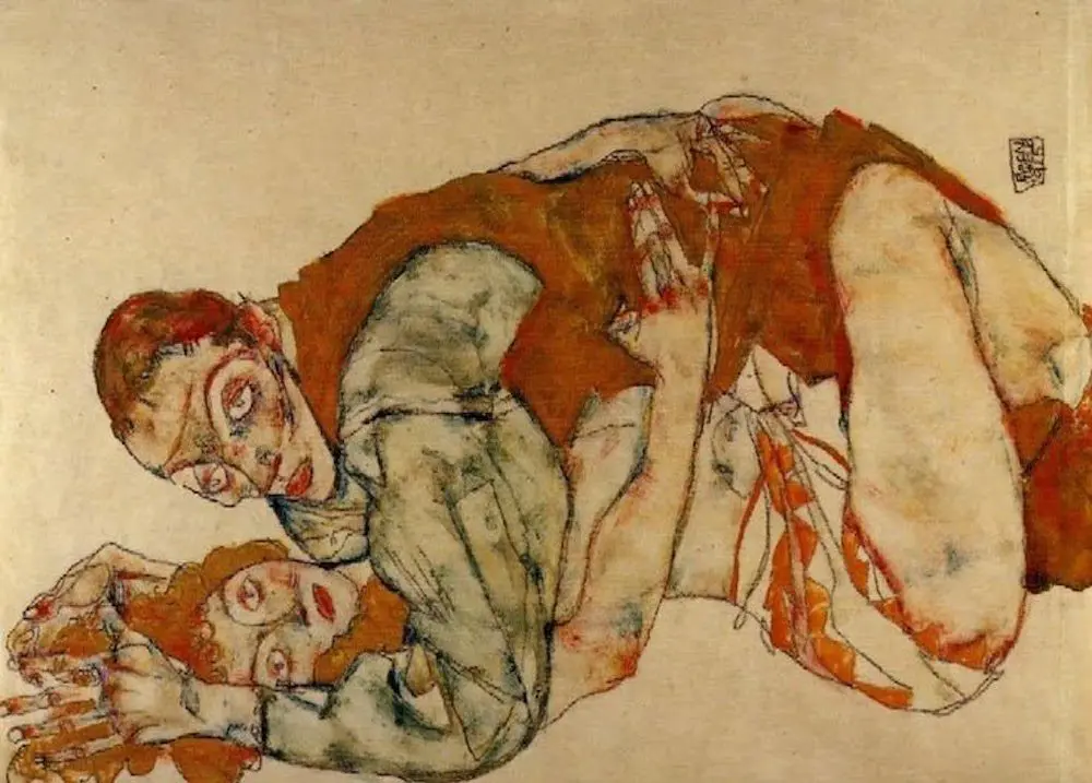 Esta entrega estará ilustrada solamente con obras de Egon Schiele (1890-1918), un pintor expresionista austríaco que se ocupó de retratar la confusión física de los amantes con una mirada muy particular. Esos cuerpos desgarbados, capturados con asombro en medio de una confusión de pieles, de sábanas, ya en su época eran muy provocativos y ahora siguen encendiendo el fuego. Hay algo del impacto de observar estas escenas íntimas que sigue funcionando aunque las obras tengan más de cien años.