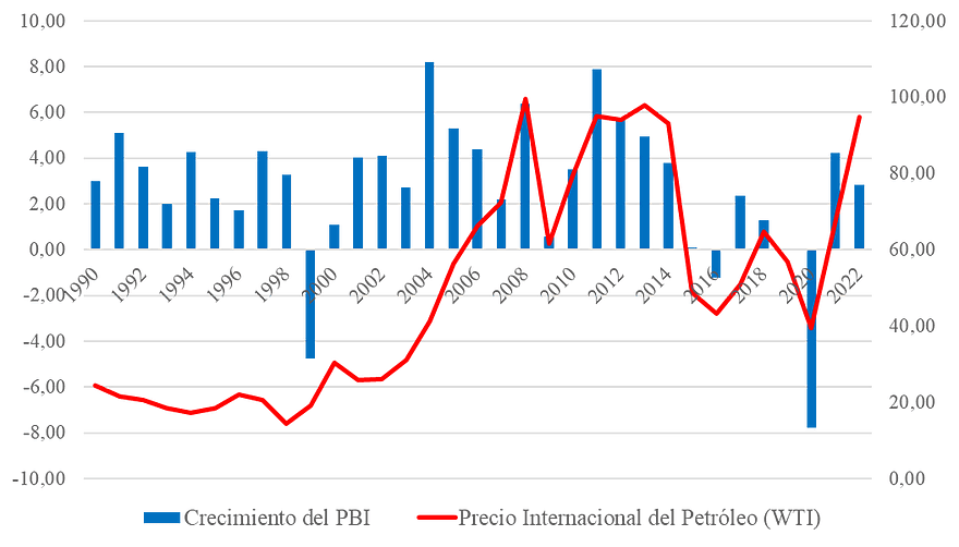 Crecimiento económico de Ecuador y precio del petróleo (eje derecho)