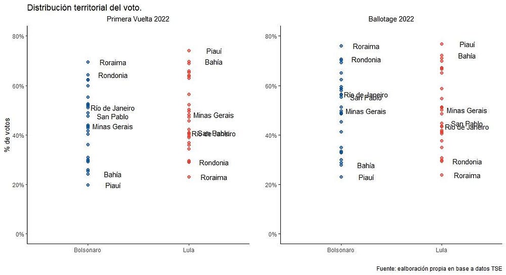 El gráfico anterior muestra la distribución territorial del voto en cada una de las unidades federativas del Brasil, los Estados. Son 27 puntitos en total (26 más el Distrito Federal). El eje vertical indica el porcentaje de votos obtenidos en cada uno, tanto para Bolsonaro (azul a la izquierda) como para Lula (rojo a la derecha). Esto para la primera vuelta (gráfico a la izquierda) y para el ballotage (gráfico a la derecha). Agrega, además, los dos Estados con mejor y peor desempeño para cada uno, y los tres más importantes en Brasil: San Pablo (22% de la población), Minas Gerais (10%) y Río de Janeiro (8%). Donde mejor le fue a Bolsonaro fue en dos Estados del Norte: Roraima y Rondonia. En una elección claramente polarizada, fue donde peor le fue a Lula. A la inversa, donde mejor desempeño tuvo el PT fue en Piauí y Bahía (ambos en el Nordeste), los de peor desempeño para el Partido Liberal (PL) del presidente de turno. Acá surge un dato no menor: Bahía es el 4° Estado en importancia en Brasil (7% de la población). Si a eso le sumamos muy buenos desempeños de Lula en Minas Gerais (ganó) y una mejoría para el ballotage en San Pablo y Río de Janeiro (ambos perdidos), entonces la victoria presidencial se explica por esta mesa de cuatro patas.