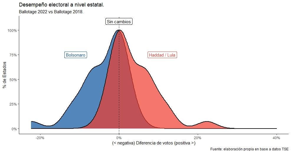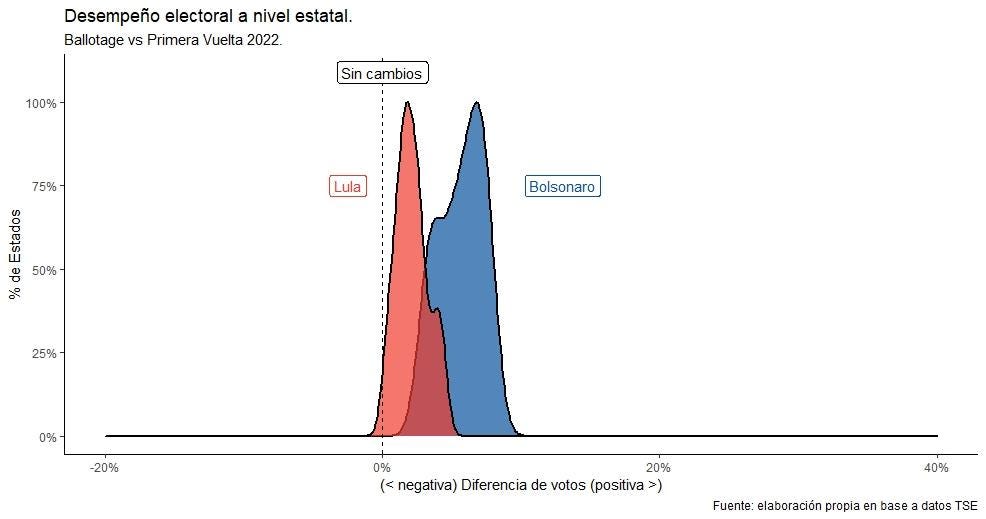 Este segundo gráfico tiene en el eje horizontal la diferencia porcentual de votos entre la primera y la segunda vuelta un mes después. En el eje vertical se calcula la proporción de Estados. Vas a ver que hay una línea punteada negra que dice “sin cambios”. Indica exactamente el punto cero del eje horizontal, lo que significa que no hubo cambios en la proporción de votos obtenidos entre rondas electorales. Hacia la izquierda, significa una pérdida de apoyos. A la derecha una ganancia. Combinado con el gráfico anterior, Bolsonaro recuperó mucho terreno. Ganó votos en todos los Estados, y lo hizo en una mayor magnitud que Lula: entre 3% y casi 8%. Por eso la mancha azul está más a la derecha. Una remontada feroz. El hombre de la voz ronca perdió votos en unos poquitos (Acre, Amapá, Amazonas y Roraima) y creció en casi todos, pero lo hizo en menor medida: entre 0,4% y 4%. Un susto.