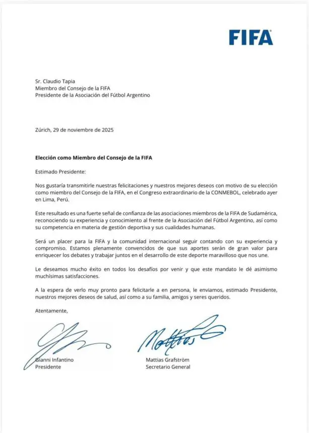 Pasó algo más: las diez asociaciones del fútbol de Sudamérica que conforman la CONMEBOL eligieron a Tapia como su representante ante la FIFA, lugar que durante décadas ocupó Brasil. Como si fuese una coreografía planificada, Gianni Infantino envió una carta de reconocimiento por eso. La nota puede ser leída como un mensaje de la cúpula de la FIFA al Gobierno argentino. Un dato más: tampoco habría dado resultado la gestión para lograr una foto entre Milei y Lionel Scaloni.