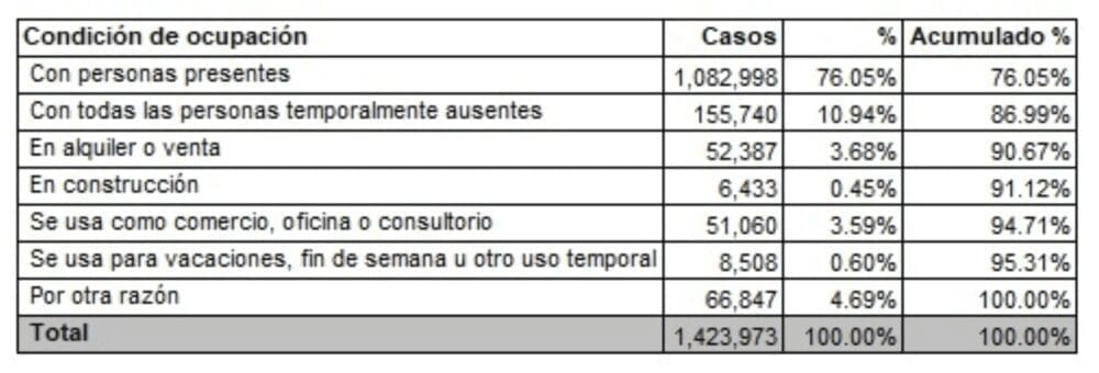 SumateOtro de los datos que te menciono bastante es la cantidad de viviendas vacías que hay en nuestras ciudades, que contrasta con el déficit de vivienda. El censo nos da una idea apenas general de la ociosidad de vivienda porque para la persona censista es difícil saber por qué nadie le contesta cuando toca el timbre o golpea la puerta (lo primero que tiene que anotar en su planilla). Muchas veces no logra saber a ciencia cierta si es una vivienda que está simplemente deshabitada sin razón aparente o si está en venta o alquiler a la espera de una buena oferta (las dos formas que podríamos definir como “ociosa”), si se trata de una casa de fin de semana o si se usa como oficina u otro uso comercial. Por lo que sea, en el día del censo no había nadie.