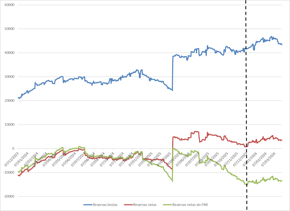 Reservas internacionales brutas, netas y netas sin desembolsos del FMI (07-12-2023 – 31-03-2026, en millones de USD)