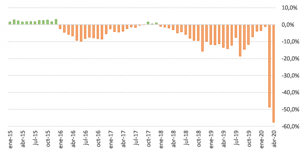 - Ventas minoristas de las pymes: Un dato importante por ser de los primeros que se publican sobre la actividad económica durante abril (mes completo de cuarentena), que confirma lo que ya se veía en marzo. Las ventas minoristas cayeron -58% respecto el mismo mes del año anterior y -27% respecto de marzo, que ya había estado parcialmente afectado por el COVID-19. A nivel desagregado, mientras los rubros esenciales se contrajeron -31% anual, el resto tuvo una baja promedio de -75%. El 94,5% de los comercios pymes relevados tuvo declives en sus ventas y no llegó a cubrir sus costos operativos.