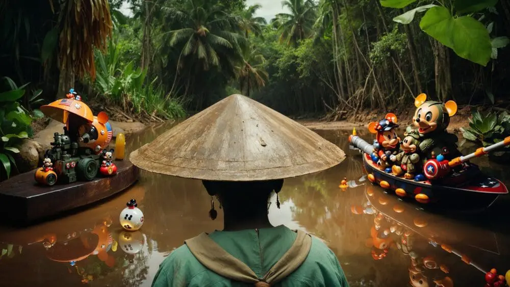 Estamos en el delta del río Mekong acompañando a una familia de agricultores, la última que queda después de que el ejército norteamericano haya arrasado el lugar y levantado los diques para que todo se inunde y corte la vía de suministros. Lo son todas, pero la guerra de Vietnam es una guerra especialmente de logística y la relevancia de la Ruta Ho Chi Min así lo demuestra (ver cómo funcionaba a través de esta charla TED es, quizás, una herejía que vale la pena). Nuestra familia de agricultores es parte del sistema de mensajería y suministros: “somos las venas que ayudan a transportar la sangre desde el corazón a otras partes del cuerpo”. Tienen la misión de sobrevivir en un campo abierto, ocultos entre el agua y las plantas, de la visión de los helicópteros norteamericanos. Después de tantas películas, incluida Apocalypse Now, en las que vimos la guerra desde los helicópteros, ahora la vamos a ver desde abajo. Desde los que no pueden disfrutar el olor del napalm por las mañanas porque lo reciben.
