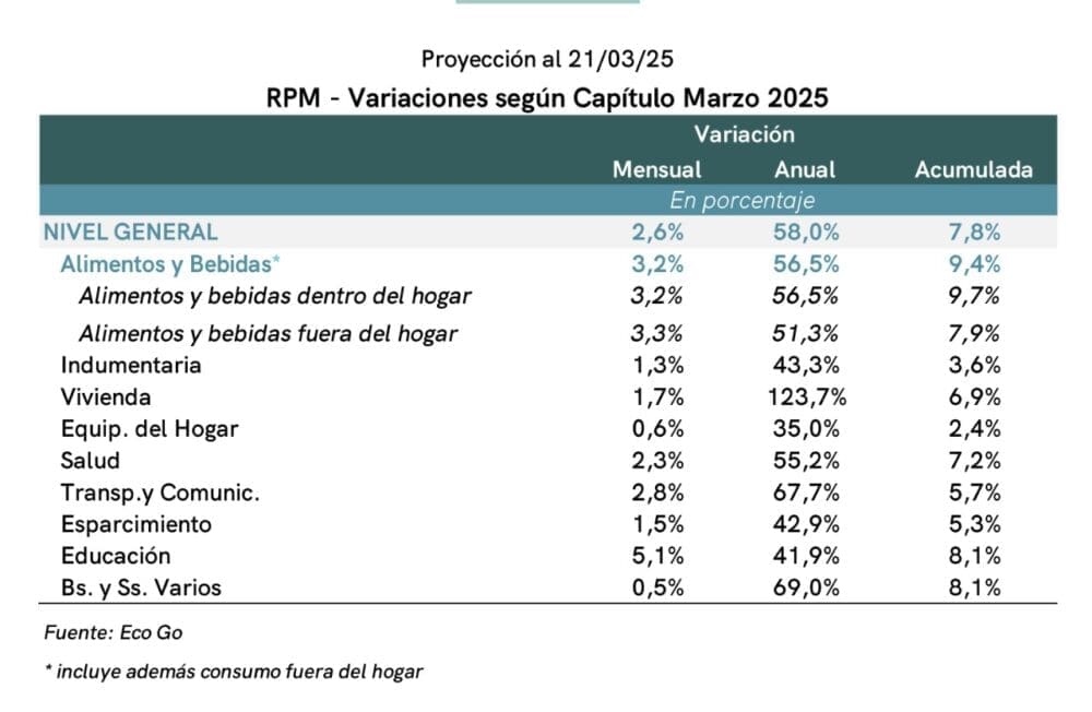 Según la consultora Eco Go, con datos hasta la tercera semana del mes, la inflación de marzo estará en la zona del 2,6%, con un incremento en la canasta de Alimentos y bebidas de 3,2%. El rubro Educación subirá 5,1% en el mes y los servicios de Salud y Transporte y Comunicaciones, 2,3 y 2,8%, respectivamente. Otros rubros, como Indumentaria, tuvieron subas en torno a 1,5%.