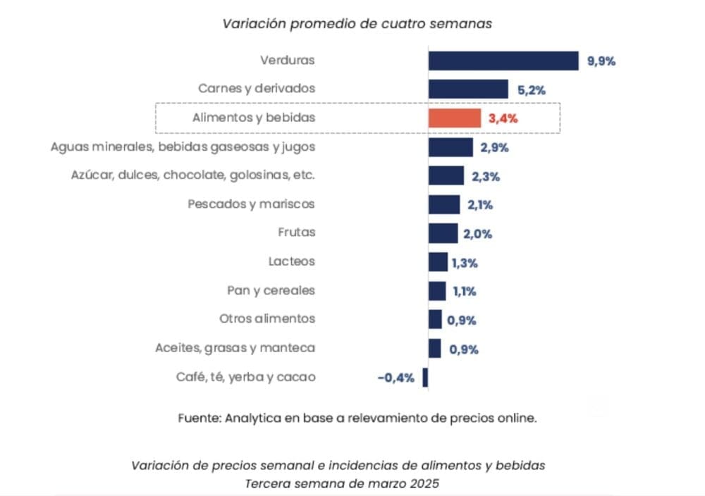 La medición semanal que hace Analytica –en este caso, con datos hasta la tercera semana– arrojó un promedio de 3,4% de inflación para los alimentos. La firma también relevó subas de Verduras de 9,9% y de Carnes del 5,2%.