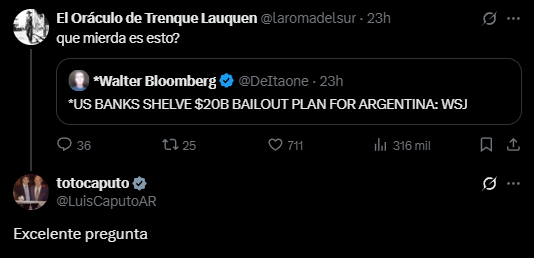 En el mercado, según confió un consultor a Cenital, hay una lectura bien política: indica que la garantía del préstamo de los bancos sería del Tesoro de EE.UU. y, a raíz del costo político que tuvo Scott Bessent por jugar tan fuerte con Argentina, la decisión sería cerrar el capítulo argento con el planteo de que se puso plata y se ganó plata, además de salvar a un socio en el hemisferio sur. Sin garantía del Tesoro, los bancos no prestan.