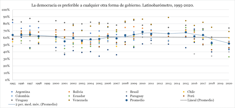 Vos pensá si, tal vez, no estamos frente a una de estas coyunturas con una pandemia que expuso, potenció y acrecentó la crisis económica y social que viene afectando a la región desde hace algunos años. Por eso con el postre me puse a ver los números de la encuesta regional de Latinobarómetro publicados con su último informe del relevamiento realizado en 2020. Me preocupó un poco Juano cuando levantó que la democracia está en sus valores más bajos históricos y no repunta. Tiene razón.