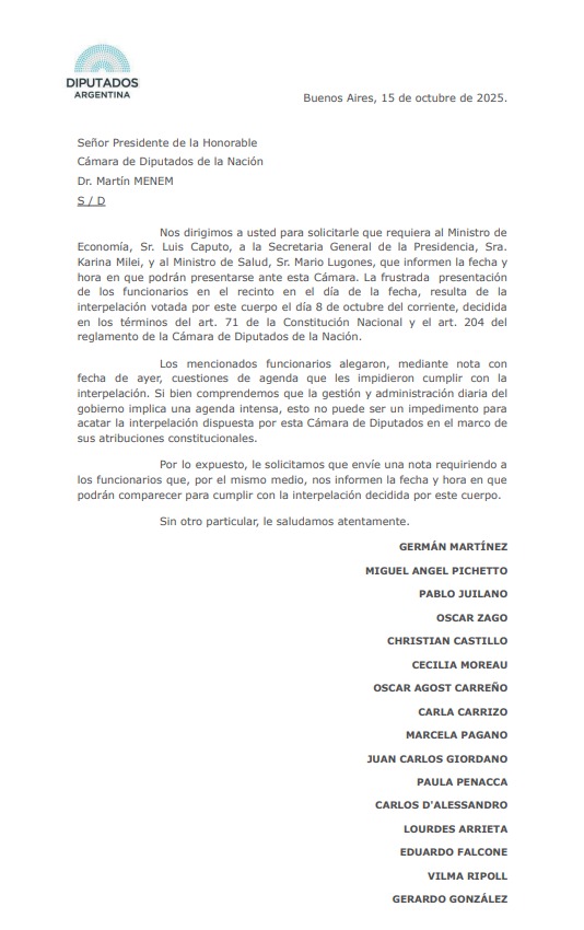 - Varios diputados le exigen al presidente de la Cámara, Martín Menem, que reprograme las citas a Luis Caputo, Karina Milei y Mario Lugones.