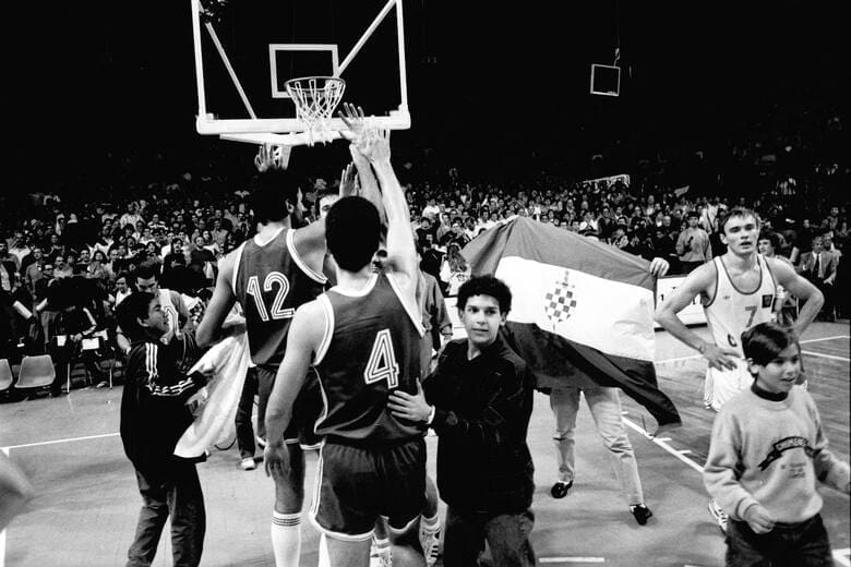 Los jugadores, cuenta Tony Kukoc en el documental, habían recibido una suerte de memo antes del Mundial, que les indicaba que debían ignorar cualquier manifestación nacionalista que pudiera aparecer durante los partidos. Habían visto banderas croatas en las tribunas en partidos anteriores. Pero ahora la bandera está frente al rostro de Vlade Divac, el serbio. Las cámaras de televisión y algunos fotógrafos, en medio del tumulto, registran la imagen.