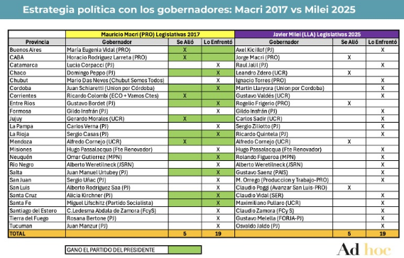 El consultor estima que el potencial es 40% y 10 millones de votos –lo que sacó Cambiemos en 2017– pero que, además de cuestiones de impacto económico y de gestión, LLA parece haber tenido mala praxis electoral. Si bien tanto Macri entonces como Milei ahora se aliaron con solo 5 de los 24 gobernadores, la diferencia del peso territorial –Cambiemos tenía PBA– y de las alianzas -Macri tenía a la UCR, la CC y gobernadores como Claudio Poggi– hace que la estrategia del armado tenga consecuencias.