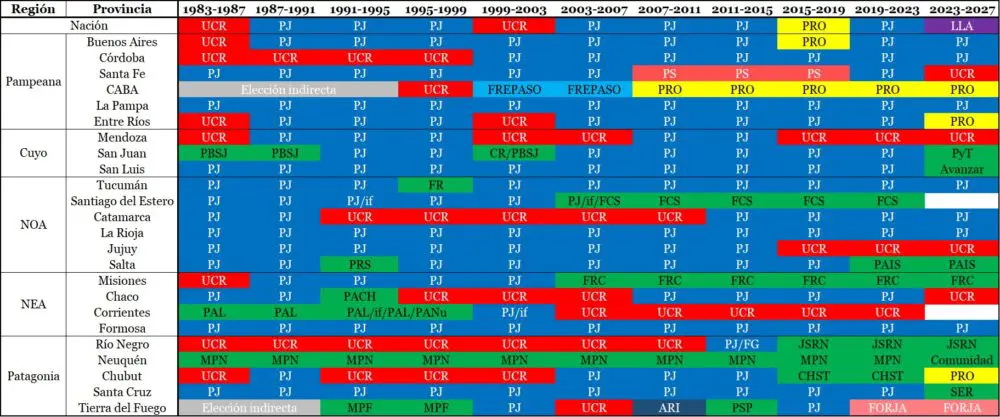 Por otra parte, los colores muestran la simbología de cada uno. Aquellos que son nacionales (PJ, UCR, PRO, PS, FORJA, FREPASO, ARI y LLA) respetan los tonos que los identifican en la competencia política. El verde identifica a aquellas fuerzas provinciales que se conformaron solo en esos distritos, sin pretensión de extenderse a otros y que se construyeron en torno a liderazgos propios de cada provincia, con un discurso y una identidad que resalta los atributos locales por sobre otros. Algo que ya peloteamos en esta entrega.