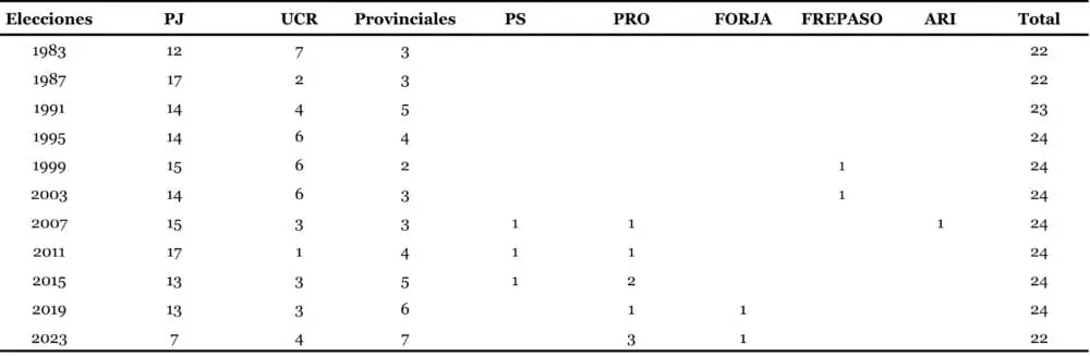 La tabla anterior sintetiza los datos del mapa y te muestra cuántas gobernaciones ganó cada partido político. La columna de “provinciales” agrupa a todos los que clasifiqué dentro de esa categoría. Como podés ver, fue su año. A comienzos de la década del ’90 había ocurrido un fenómeno similar, con las victorias del Partido Renovador de Salta, el Partido Acción Chaqueña, el Pacto Autonomista-Liberal (Corrientes), el MPN (Neuquén) y el Movimiento Popular Fueguino. La de este año es parecida, pero con una diferencia: empezó en el ciclo electoral anterior. Fijate que en 2019 ganaron 6 y este 2023 se sumaron a ese club Producción y Trabajo (San Juan), Avanzar (San Luis) y SER (Santa Cruz). Los tres están enrolados en Juntos por el Cambio, pero tienen una construcción política con fuerte impronta provincial que decidió acoplarse a una coalición electoral nacional. Si en Santiago del Estero vuelve a revalidar el Frente Cívico por Santiago en 2025, entonces habrá un nuevo récord de ocho y los provinciales serán mayoría por primera vez en 42 años.