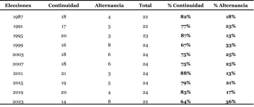 La tabla anterior resume aquellas provincias que continuaron con el mismo espacio político gobernando (aunque hayan cambiado de cara) y aquellas que tuvieron alternancia. Esta ronda de elecciones distritales muestra porcentajes de derrota de los oficialismos similares a 1999, aunque levemente superiores en este 2023. La diferencia sustancial radica en que el dato de hace 24 años incluye a todas las provincias. Como te mencioné, aún faltan Corrientes y Santiago del Estero, que votan en 2025. Si en la primera gana la UCR y en la segunda el FCS, entonces los valores serán idénticos.