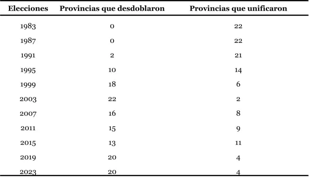 Cuando indica “if” significa intervención federal. Hay celdas que unifican años dado el desacople que generaron esas decisiones en el ciclo electoral provincial. Para sintetizar la tabla, se acomodaron los de Santiago del Estero y Corrientes al del resto de las provincias. Dado el momento en que descoordinaron sus respectivos calendarios, asumimos que las dos cierran el proceso de renovación ejecutiva provincial.