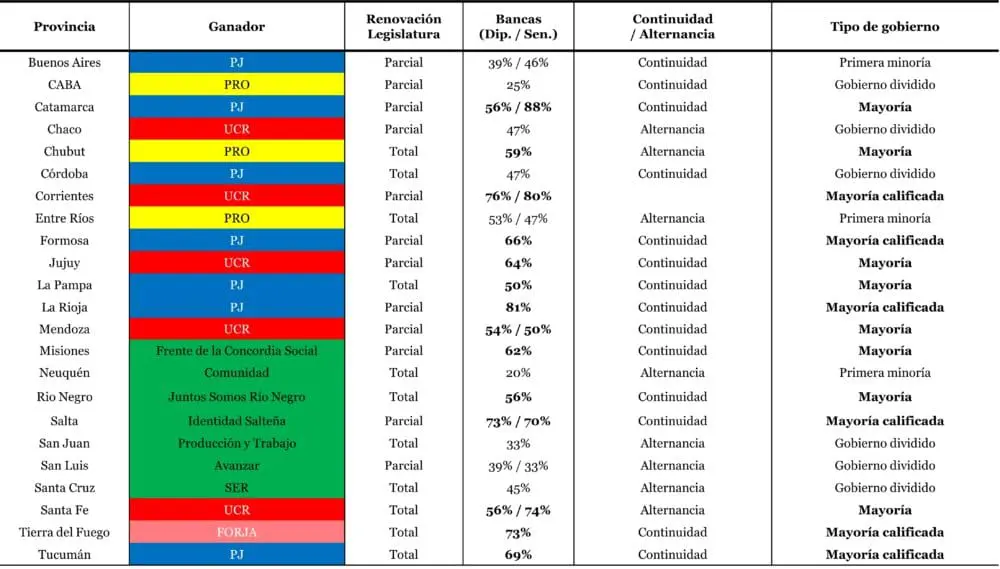 La tabla que vas a leer a continuación tiene banda de data. Incluye las 23 elecciones provinciales que se celebraron este año (22 generales y 1 legislativa en Corrientes). La segunda columna muestra el partido que ganó con el color correspondiente. La tercera, el porcentaje de bancas obtenidas por cada espacio político (aquellas provincias que son bicamerales incluyen el valor para los dos recintos separados por una barra). La cuarta suma el dato de si hubo alternancia o continuidad (Corrientes no dice nada porque no hubo elecciones ejecutivas, con lo cual el gobierno aún tiene mandato por delante). Y la quinta es mi favorita: el tipo de gobierno que de base recibe cada gobernador electo. Son cuatro categorías distintas, que van de menor a mayor poder de fuego en términos decisorios y son las siguientes: