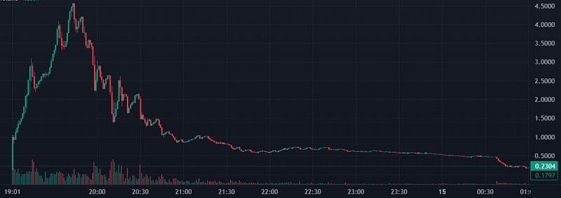 15 de febrero, 00:51. El precio toca fondo (USD 0,2) perdiendo el 96% de su valor máximo. Según Eduardo Garzón, al final hubo nueve cuentas que ganaron unos USD 87 millones a costa de unas 50.000 personas que compraron la moneda y vieron desaparecer su valor a las pocas horas.