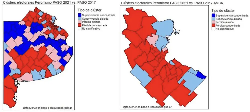 La segunda historia que te vengo a contar es sobre la interna a cielo abierto del Frente de Todos en las semanas posteriores al resultado de septiembre pasado, que derivó en la carta de Cristina. Este es el segundo mito. No hubo una amenaza de rompimiento ni de abandonos peronistas. Hubo pisos perforados. Y esto puede mapearse. Una técnica útil para este tipo de análisis es la que permite detectar hot spots, lo que en castellano significa “puntos calientes”. También se los llama clústers. Cuando analizamos la distribución espacial del voto podemos evaluar en qué medida la pérdida o ganancia de votos entre elecciones está concentrada geográficamente en una región específica, dispersa en distintas unidades territoriales o aleatoria sin patrón alguno. Este cálculo consta de dos partes. Primero, tal como te vine contando hasta ahora, se calcula el diferencial de votos entre las PASO 2021 y las PASO 2017 en cada uno de los municipios de la provincia de Buenos Aires. En una segunda instancia, se compara si ese valor es similar al promedio de los valores de los municipios que lo rodean. Esta cuenta se denomina LISA (Local Indicators of Spatial Association) y estima la autocorrelación espacial de la distribución del voto. Más nerd, imposible. Con este cálculo, armé cuatro tipos de clústers. En aquellos municipios donde hubo crecimiento de votos y a su alrededor hay distritos con valores similares, hubo una supervivencia concentrada (color azul). En cambio, en aquellos donde hubo un alza pero lo rodean otros donde se perdieron votos hay una supervivencia aislada (color celeste). Del lado de las pérdidas, en aquellos municipios donde hubo merma de votos y lo rodean otros donde la caída se produjo en proporciones similares, hubo pérdida concentrada (color rojo). Y aquellos donde la pérdida estuvo rodeada de distritos donde se creció en votos, hay pérdida aislada (color rosa).