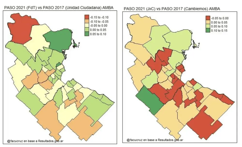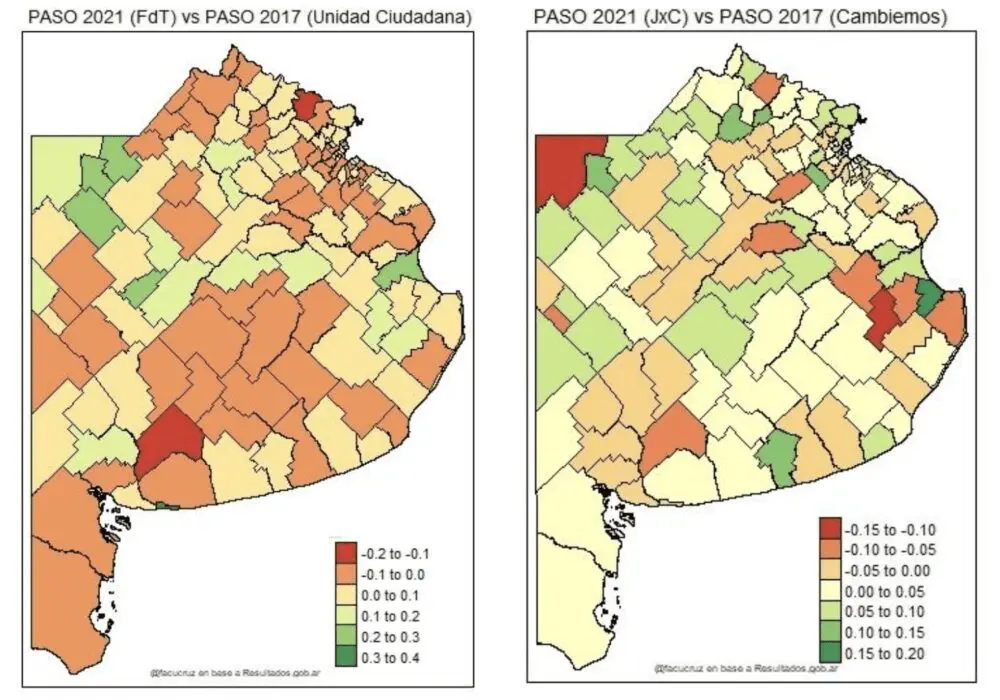 Las elecciones tienen sus historias. Son relatos que se construyen a partir de resultados y siempre generan narrativas de ganadores y de perdedores. Hoy vengo a contarte dos historias. La primera es que la victoria de Juntos por el Cambio sobre el Frente de Todos no se sustentó en una topadora electoral. Este es el primer mito. Es cierto que el peronismo perdió una vez más la provincia de Buenos Aires, ese fuerte que siempre pareció impenetrable pero que tiene más de un pasadizo secreto. Si vemos en detalle la distribución geográfica del voto en las PASO 2021 y la comparamos con las PASO 2017, lo que pareció un avasallamiento puede ser una oportunidad de reversión. En los mapas a continuación podés ver la merma (colores rojos, amarillos y naranjas) y la ganancia (colores verdes) en el porcentaje de votos tanto para el peronismo (Frente de Todos en 2021 y Unidad Ciudadana en 2017) como para Juntos para el Cambio (Cambiemos en 2017). Tomo en cuenta el voto a diputados nacionales.