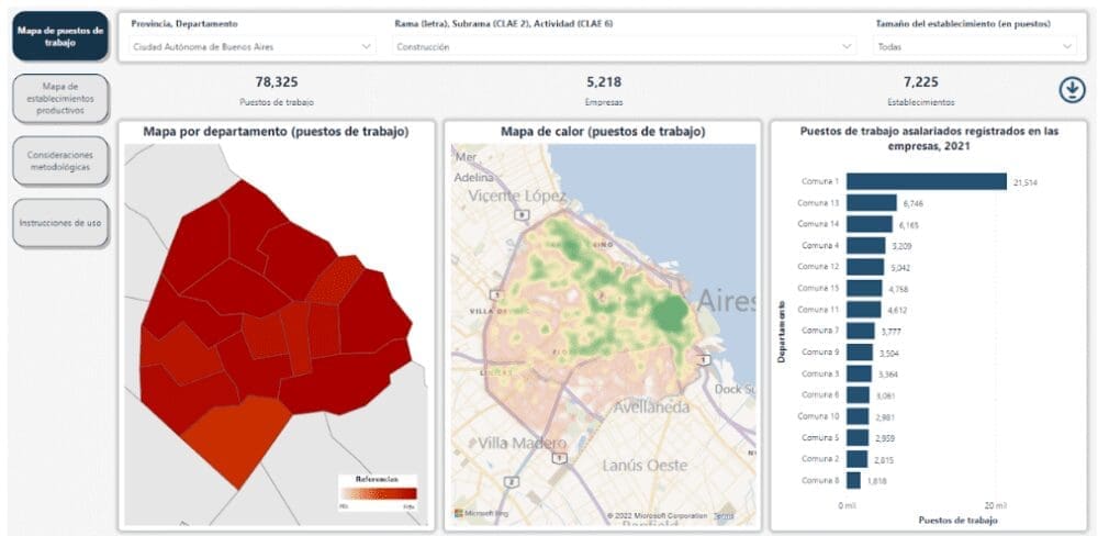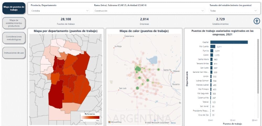 Quizás más relacionado con este newsletter podemos ver cuántos puestos de trabajo y cuántos establecimientos dedicados a la actividad de la construcción hay en determinada ciudad. La herramienta también genera unos mapas de calor muy atractivos. Mirá, acá “hice” un par con los datos que te mencioné recién mirando la Ciudad de Buenos Aires y la provincia de Córdoba. También te podés descargar las bases de datos con la latitud y longitud si te las rebuscás con alguna de las herramientas digitales para hacer mapas. Ya tenés plan para el finde.