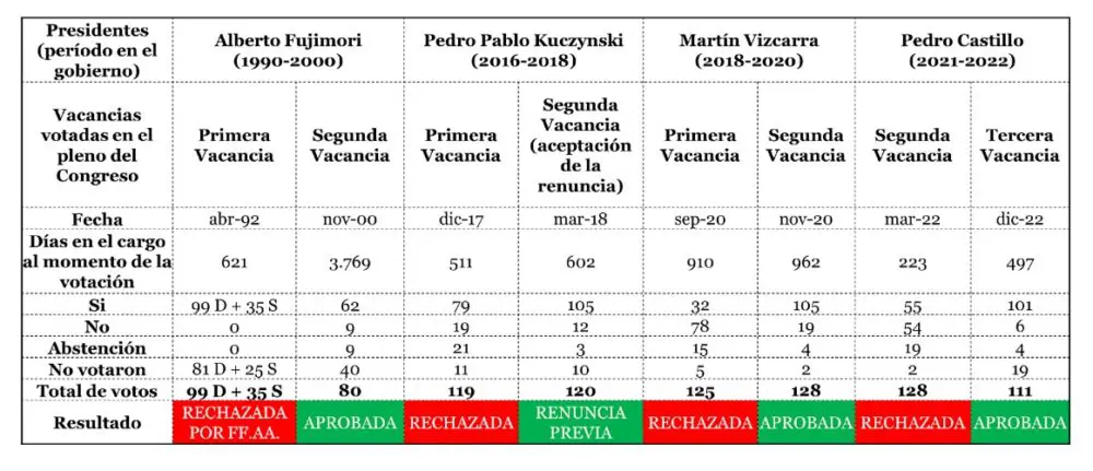 Fuente: elaboración propia en base a Wikipedia. Fujimori sufrió dos intentos de vacancia, pero como consecuencia del autogolpe de 1992 las Fuerzas Armadas rechazaron lo decidido por la mayoría absoluta de ambas cámaras del congreso. En la reforma constitucional de 1993 el Poder Legislativo de Perú pasó de ser bicameral a unicameral.