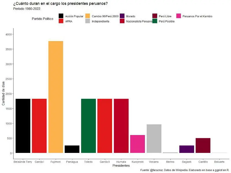 En medio de estas regularidades, Pedro Castillo fue el presidente electo que menos duró en el cargo: 497 días. Menos que Pedro Pablo Kuczynski (PPK, Peruanos para el Kambio), que se fue en un escenario bastante calamitoso. Digo electo porque Valentín Paniagua, Martín Vizcarra, Manuel Merino y Francisco Sagasti fueron designados titulares del Poder Ejecutivo por estar en la línea de sucesión. Igual que Dina Boluarte. Lo de Castillo, entonces, tiene algo nuevo y algo constante. Lo nuevo es justamente la cantidad de días que duró. Lo constante es que no es el único: todas las barras después de Ollanta Humala no llegan a los 1.826 días, la cantidad que están los que terminan los 5 años de mandato.